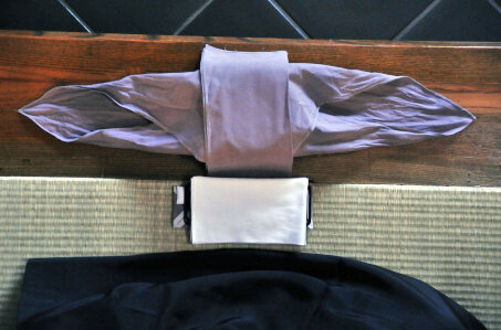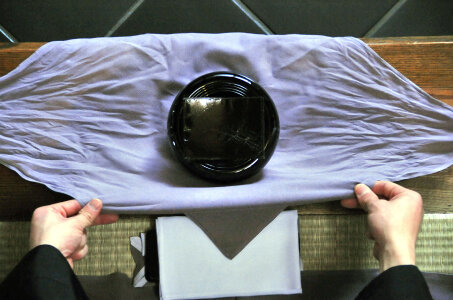 First, take out bowl wiping cloth (a dishcloth; a cloth about 36 centimeters—14 inches—square, with edges that are rolled over and stitched), fold it in half horizontally, then in thirds vertically; lay it on top of utensil bag (chopsticks bag) and set bag down horizontally in front of knees.