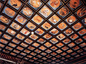 Il soffitto della Sala Hoko è decorato con pitture che raffigurano fiori e animali.